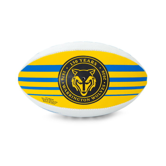 Celebrate 150 years of Warrington Wolves with this special edition midi ball! Featuring a striking Primrose & Blue design, this collectible midi rugby ball is perfect for fans of all ages. Ideal for display or a quick game, show your team pride in style!